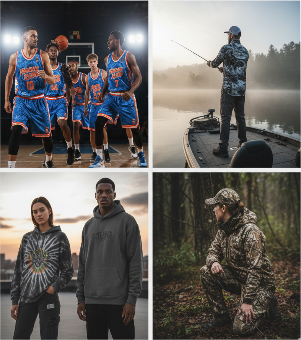 Full Sublimation: Edge-to-edge, permanent printing ideal for team uniforms and technical gear.
